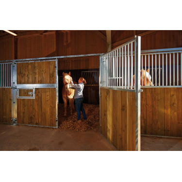 Cette façade de boxe est particulièrement populaire pour sa conception facilitant le nettoyage rapide et l’accessibilité des boxes. L'ouverture est facile grâce aux deux parties ouvrantes, montées sur des gonds avec une partie filetée réglable. La porte de 1,37 m est toujours située à droite et se fixe au sol via des poteaux galvanisés sur platine carrée, assurant une grande stabilité.
