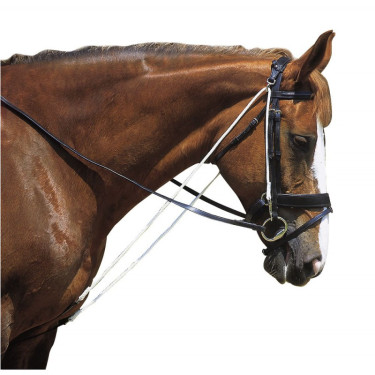 Le chambon Excelsior à poulies se distingue par son action directe sur le mors, incitant le cheval à garder la nuque basse. Idéal pour le travail en longe, il offre un contrôle précis et efficace.