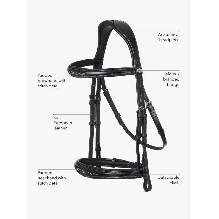 La bridon de compétition LeMieux est de qualité de concours avec un frontal et une muserolle rembourrés de forme élégante avec des coutures décoratives.