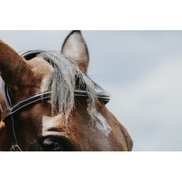 Fabriqué en cuir de buffle avec têtière et frontal doublés en cuir de vachette, ce bridon allie robustesse et finitions soignées avec des surpiqûres blanches élégantes.
