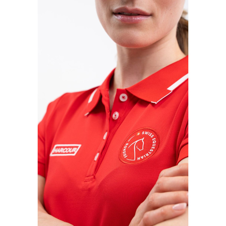 Fermeture du col par quatre petits boutons pour un look raffiné. Le polo est orné du logo Swiss Equestrian Friends sur la poitrine gauche et dans le dos, du logo Harcour sur la poitrine droite, ainsi que du drapeau suisse brodé sur la manche gauche.