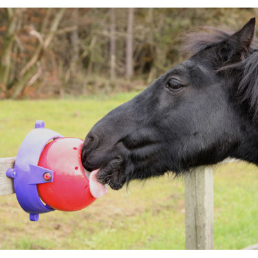 Le Tongue Twister est idéal pour les chevaux nerveux ou en box étroit. Il peut être utilisé avec un ou deux Little Likits. Pendant que votre cheval lèche le Likit, la balle se déplace, l'obligeant à rester plus longtemps à jouer pour obtenir sa récompense. A utiliser en box ou au paddock.
